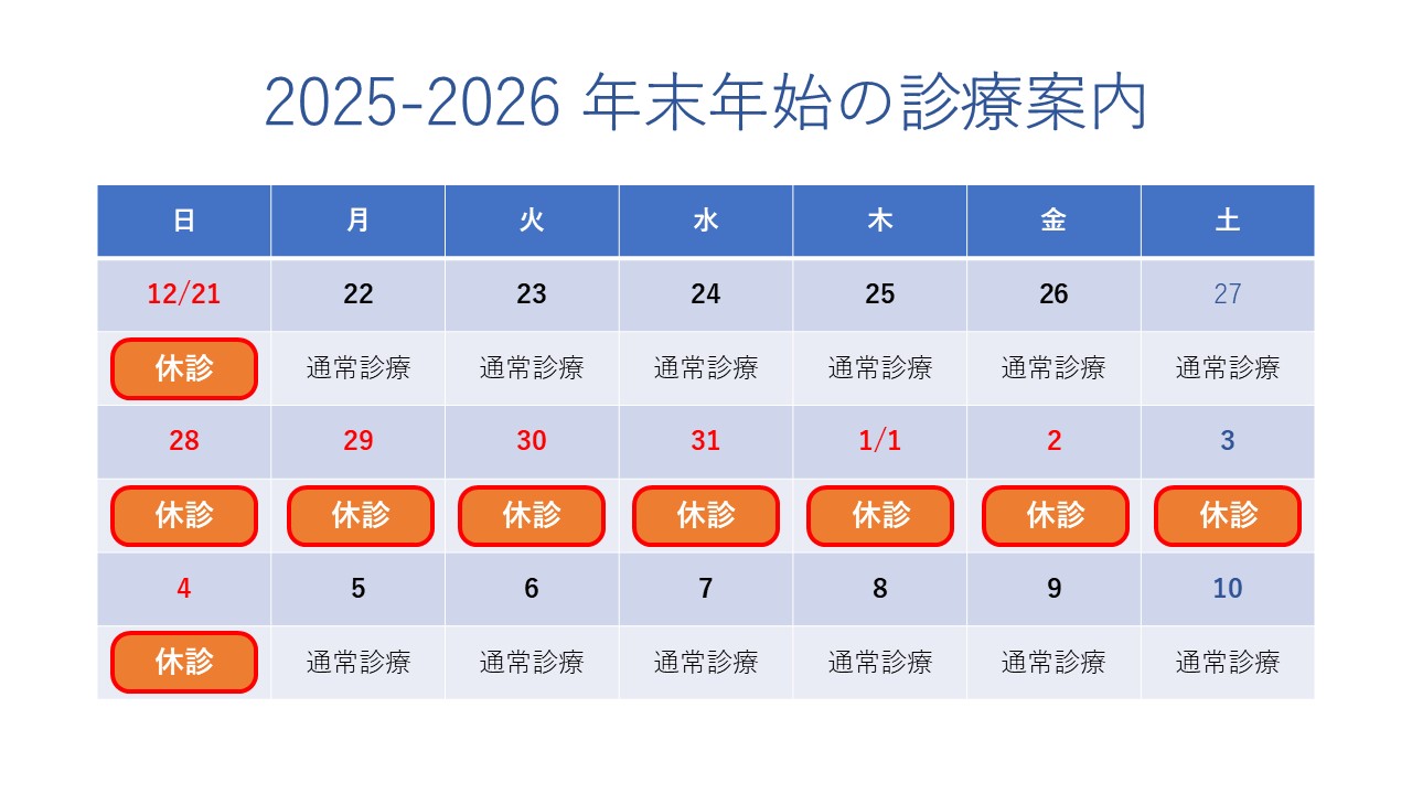 2025年12月27日(土)まで通常診療 (土曜のため受付17:00まで)